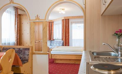Suite mit Küchenzeile, Sitzecke, Schreibtisch, Sat TV LCD 42“, Safe und gratis W-Lan sowie Badezimmer mit Dusche, WC und Föhn. Die Familiensuiten verfügen teilweise über einen Balkon.